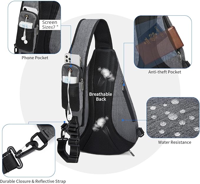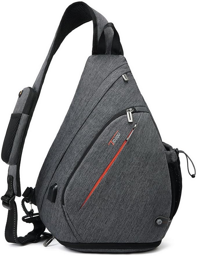 - ★ EARPHONE HOLE & USB CHARGING PORT - The sling bag crossbody men has a cell phone pocket with earphone hole on the strap. This is convenient for you to use the mobile phone and enjoy the music at anytime and anywhere. Please noted that this sling bag for men crossbody doesn't have power bank, usb charging port of this one strap backpack for men only offers an easy access to charge.