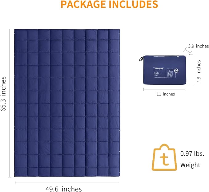 - LIGHTWEIGHT & PACKABLE- At 0.97 lbs., this packable Down Blanket gives you the comfort you would expect from an outdoor camping quilt. Makes a great addition to any sleeping system in the cold weather or on its own during the warmer seasons.