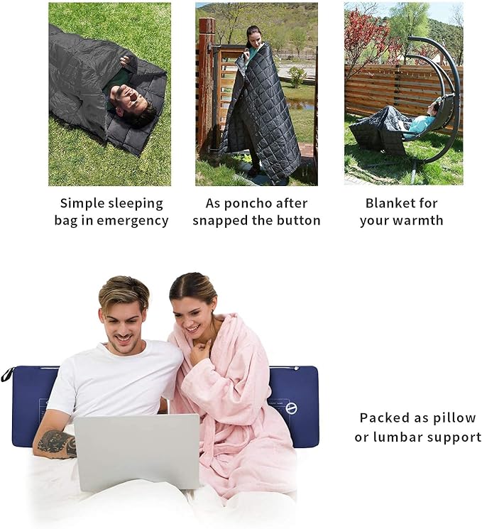 - WARM & VERSATILE- For camping, hiking, festivals or simply on your couch the puffy down blanket wraps around you and clips together to make a warm Poncho style Stadium Blanket.