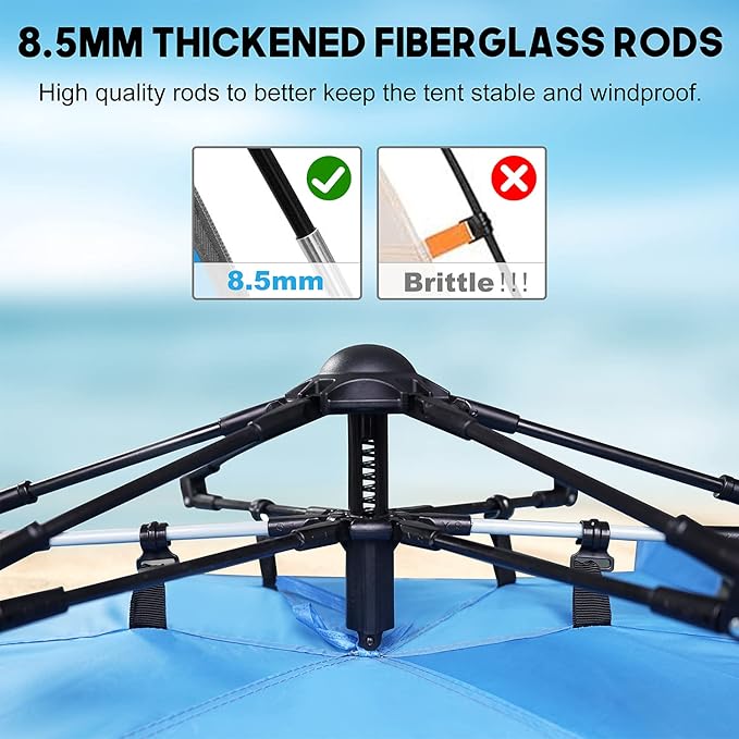 - Durable and Windproof:MIRUS beach tent is made of 8.5mm fiberglass frame, high quality poles make the beach tent more durable; And equipped with 3 sand bags, 8 steel stakes, 6 sand stakes and ropes, the combination of inserts and stakes makes the beach tent grip more firmly and resist strong winds more effectively.