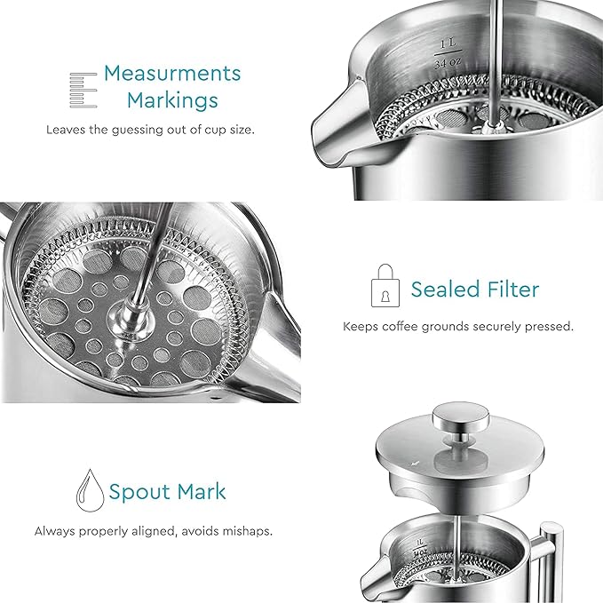 - EASY-TO-CLEAN & DURABLE DESIGN: Made from 304-grade stainless steel, this French press is rust-proof, shatter-resistant, and dishwasher safe. No confusing assembly or fragile glass here—just a sleek, long-lasting coffee maker that’s built for everyday use