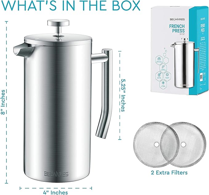 Belwares French Press Coffee Maker - 34 oz Double-Wall Insulated Coffee Press with 4-Level Filtration System, Stainless Steel 1 Liter - Perfect for Camping, Home, or Office