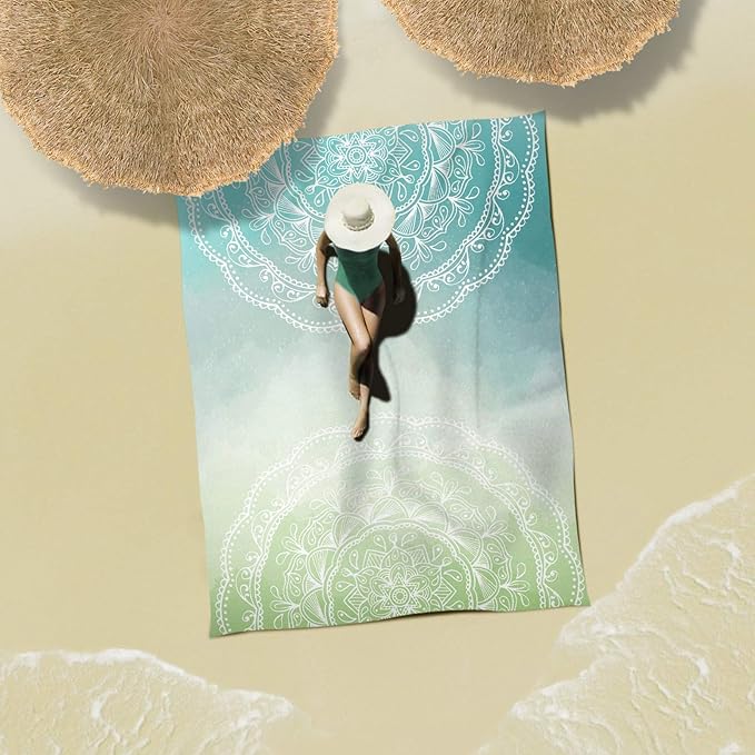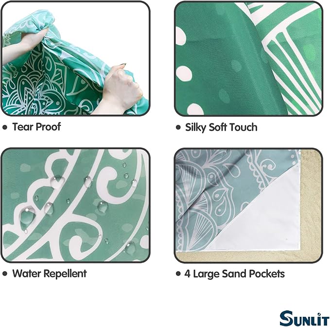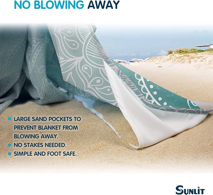 Sunlit Silky Soft 106"x81" Boho Sand Proof Beach Blanket Sand Proof Mat with Corner Pockets and Mesh Bag for Beach Party, Travel, Camping and Outdoor Music Festival, Tiffany Green Mandala