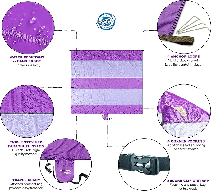 - Sandproof, Water Resistant, and Machine Washable ~ Made of 100% water resistant parachute nylon, sand doesn't stick and simply brushes or shakes right off! Aquatus blankets quick dry water, are lightweight, thin and dynamic and are perfect for an enjoyable hangout, picnic, tanning, yoga, and snacking space. Plus, say hello to an easy clean up