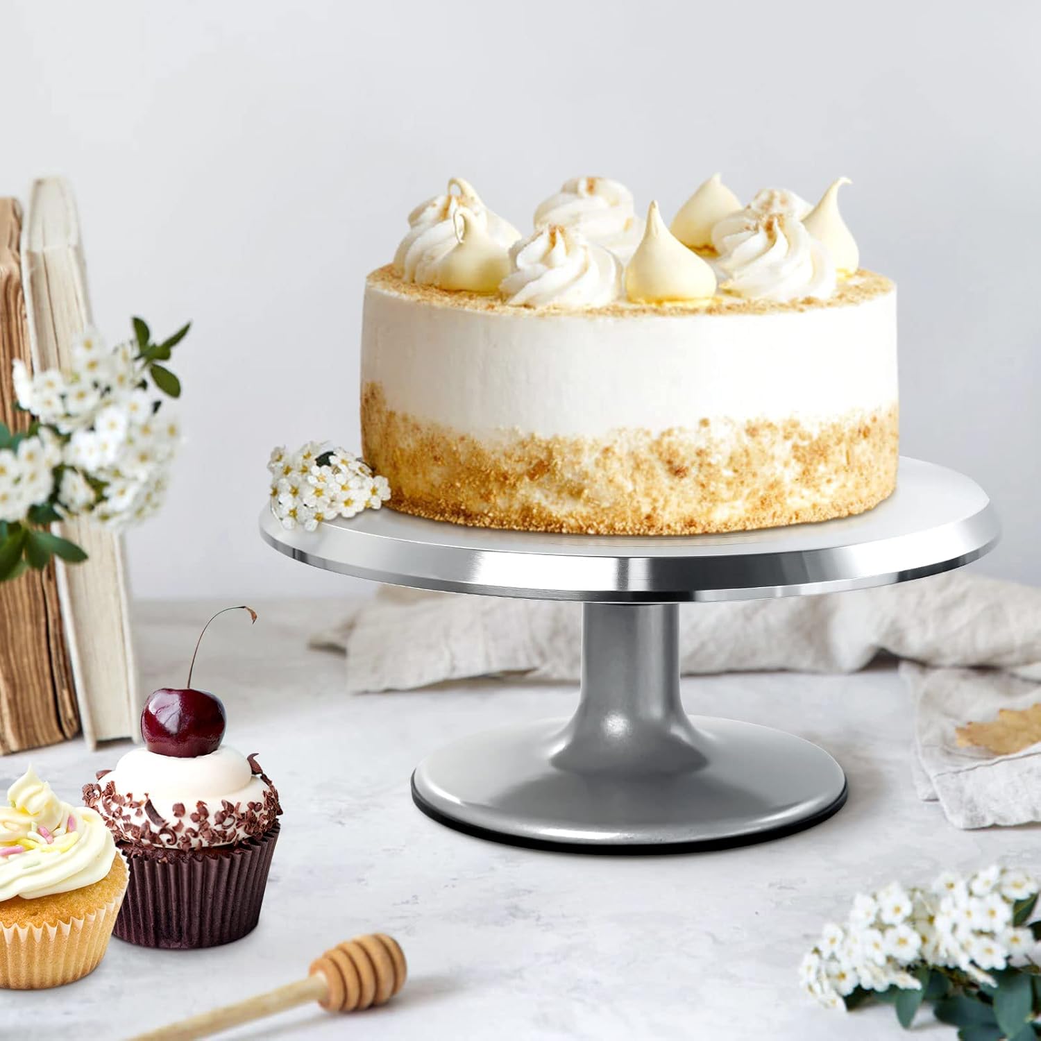 - 【Keep Flavor Original】: Made from premium stainless steel, this cake turntable does not affect the original flavor of the food and won't contaminate the food at all even you put the cakes on it for a long time