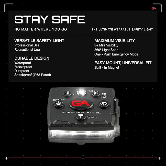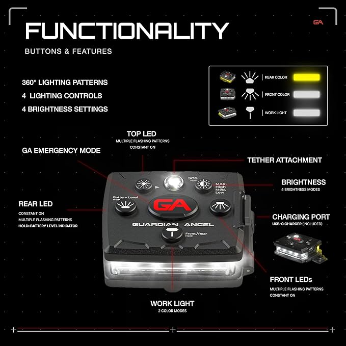 - ๐ ๐ฎ๐ ๐ถ๐บ๐๐บ ๐ฉ๐ถ๐๐ถ๐ฏ๐ถ๐น๐ถ๐๐: With 13 high-output LEDs, the Guardian Angel Micro Series keeps you visible from up to 3+ miles. With 360ยฐ lighting, others can see you from all sides. Four brightness settings, multiple flash patterns, steady burn option and Emergency Mode, ensure others can see you when needed. With 6 white LEDs on the front, 6 yellow LEDs on the rear, this device features a hands-free white flood light, a white work light, and a white top light.