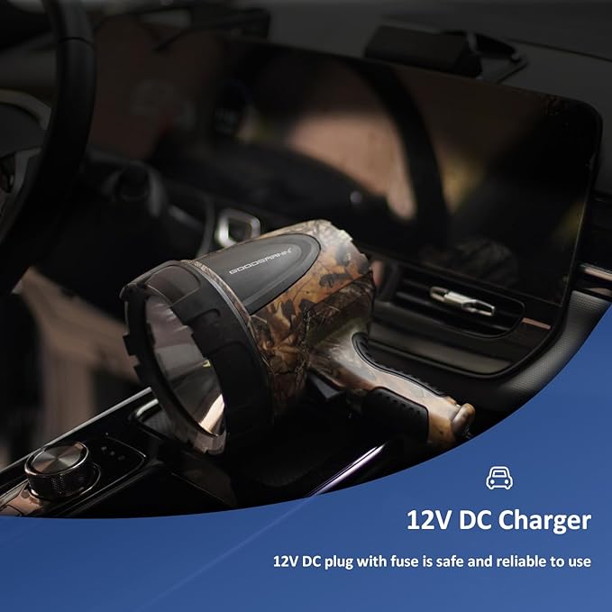 - VEHICLE CHARGING: With a 12V DC charger that connects to your car's outlet, it is suitable for a variety of environments, including vehicles, boats and outdoor environments. It is an essential companion for road trips, camping and outdoor adventures, ensuring that you can keep your handheld light charged even when you are on the go