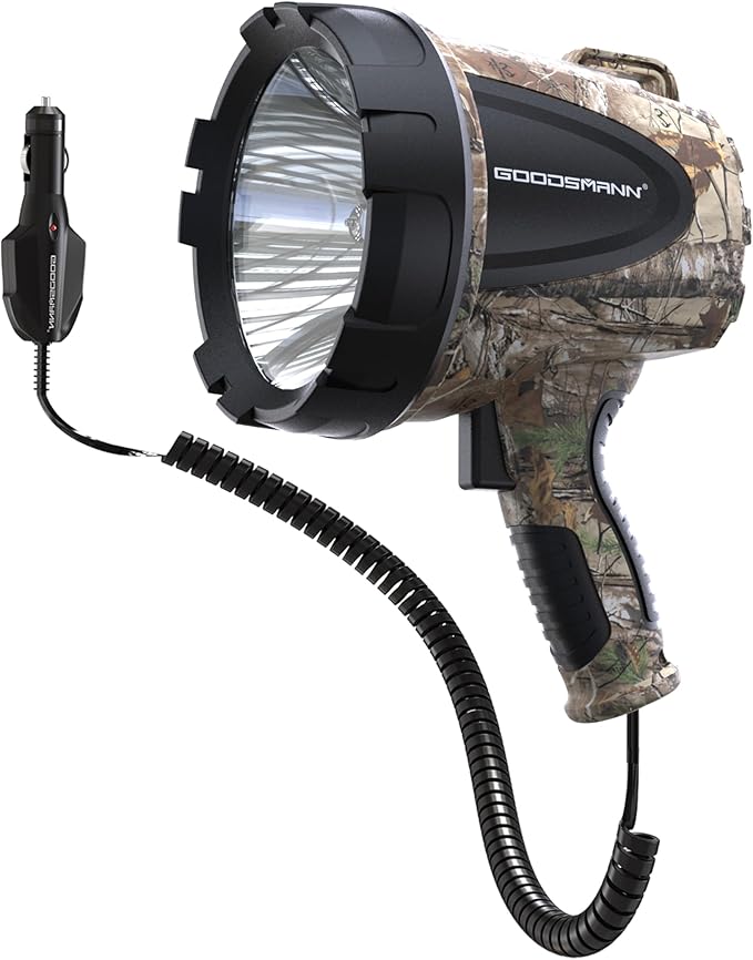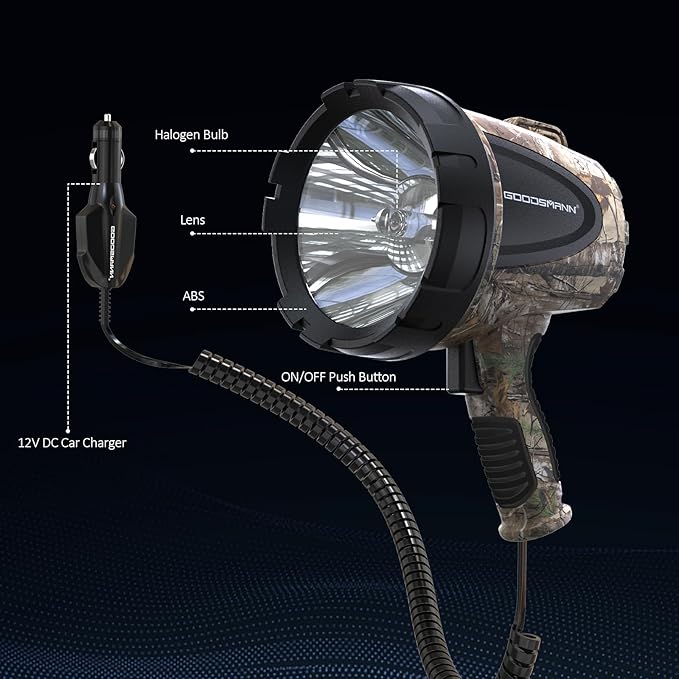 GOODSMANN 1500 Lumen Spotlight Halogen Water Resist Flashlight with 12V DC Car Charger Searchlight for Camping Boating Fishing Hunting Hiking Patrolling and Road Trips