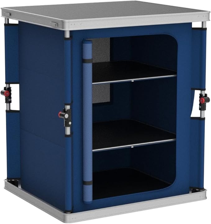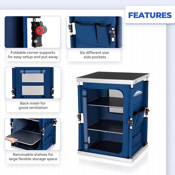 EAGLE PEAK Outdoor Folding Camping Table with Large 3-Tier Storage Organizer and Side Pockets, Easy Set Up Portable Aluminum Camping Kitchen, Blue