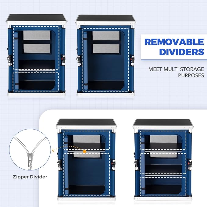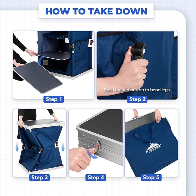 - BREATHABLE & EASY TO CLEAN: EAGLE PEAK portable camping table’s waterproof desktop and the 3 level shelves can be conveniently removed to clean when dirty. 2 mesh backside windows provide breathable airflow. NOTE:the table should not be used in the rain.