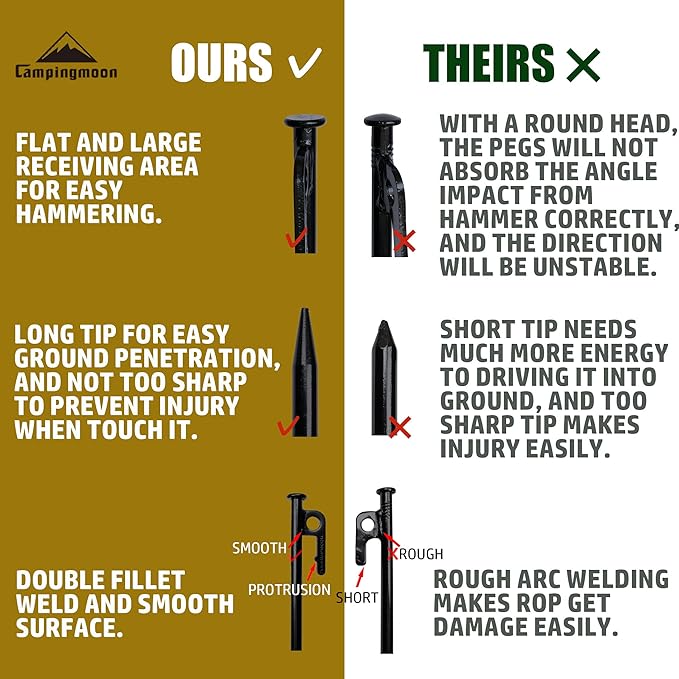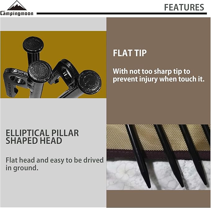 - CAMPINGMOON's heavy duty metal steel camping tent stake is made of high quality forged carbon steel S45C. This heavy duty metal steel camping tent peg is incredibly strong to holding down your tent on hard ground.