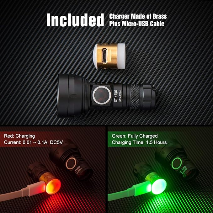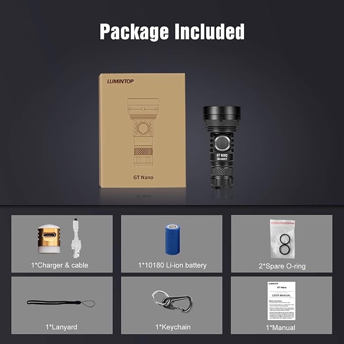 - [What You Will Get] Every LUMINTOP flashlight comes with a 2 year no questions asked quick problem solving. If you have any questions, please contact us through Amazon message. With fast customer service response, your problem will be solved within 24h. Package content: GT nano, 10180 battery, charger, keychain, micro-USB cable, lanyard, spare O-ring and user manual.
