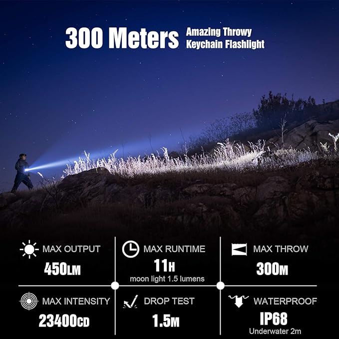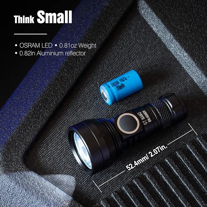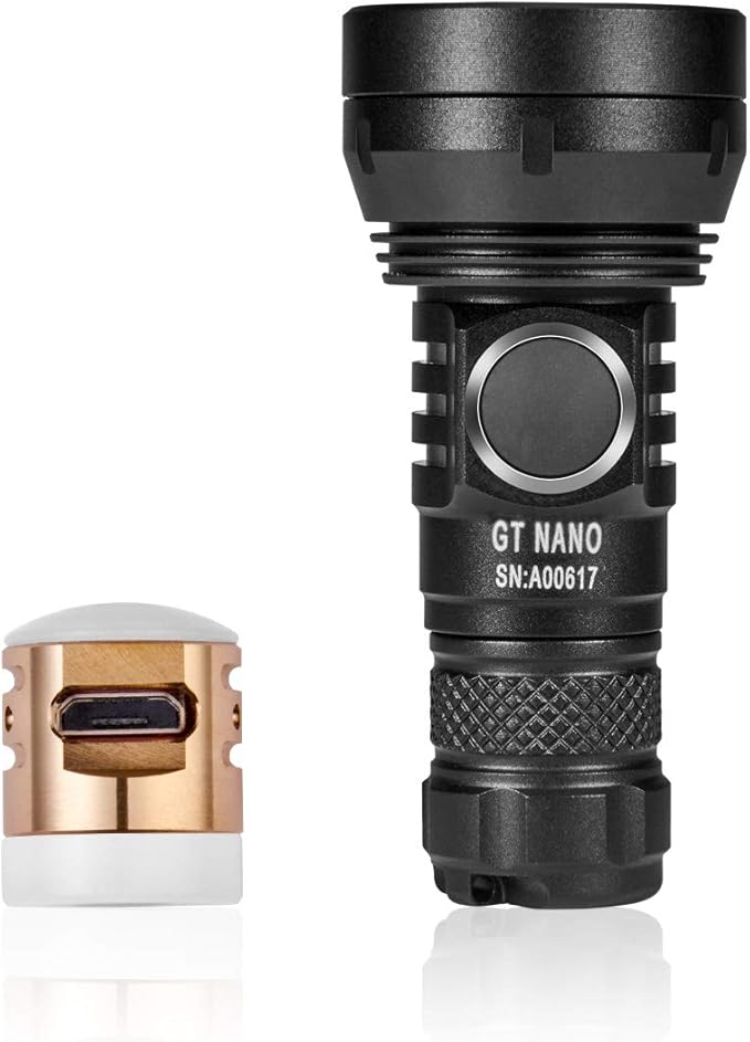 - [Compact & Durable] This mini flashlight is made of high grade areocraft aluminiu, with aluminium reflector, anti-reflective coating lens, finished by type III hard-coat anodizing, perfect threads, 1.5 meters impact resistance, IPX-8 waterproof. All its key performances are checked and approved by ANSI-F1 standard (American National Standard) . There is no any mini pocket thrower light that even came close to the GT NANO.