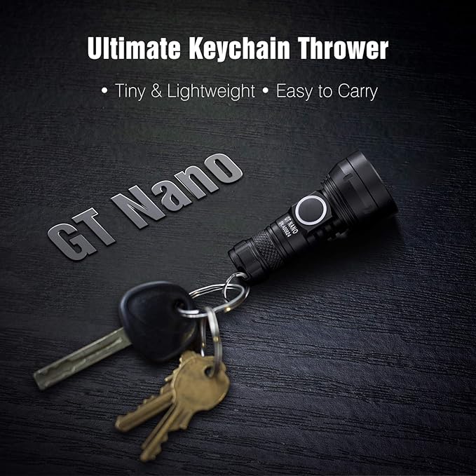 - [What Amazing & Ultimate Tiny Keychain Thrower] Only 2.07 inch in length, the GT NANO is the latest keychain flashlight and the most compact size flashlight provided by Lumintop. It ultilizes ORAM 6500K cool white LED, able to light over the amazing length of over than two football fields (984ft /300 m) paired with a 20.8mm (0.82 inch) diameter aluminium smooth reflector. There is no other decent ultra mini thrower around.