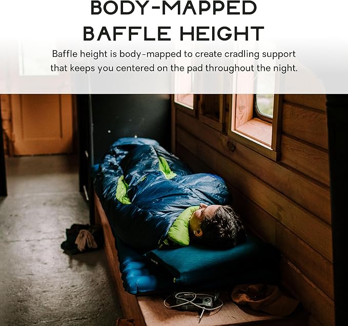 - Baffle height is body-mapped to create cradling support that keeps you centered on the pad throughout the night.