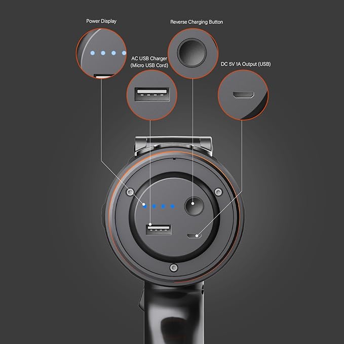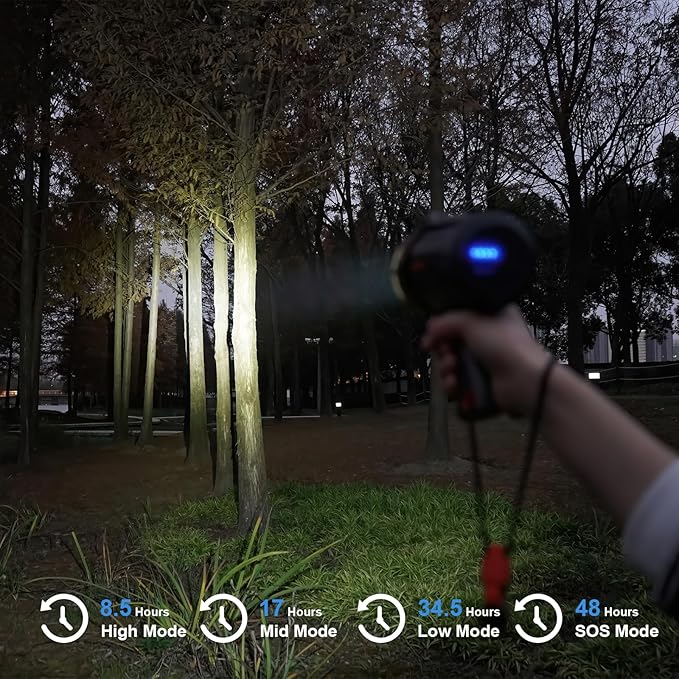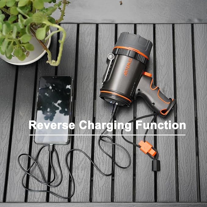 - RECHARGEABLE & PORTABLE: This 1500 lumen hand held spot lights comes with the 100V-240V home adapter with 3.9 feet USB cord. This waterproof handheld spotlight will work 7.5-8 hours on high mode, can also be used as a power bank to charge your smart devices