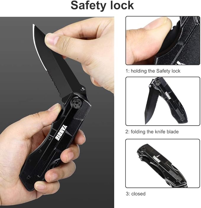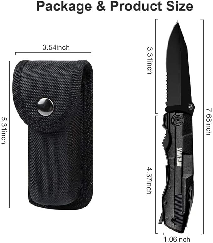 - PORTABLE AND CONVENIENT - The folding knife comes with a nylon pouch that can be attached to your belt, you can carry this switch blades wherever you go and be prepared for any situation.