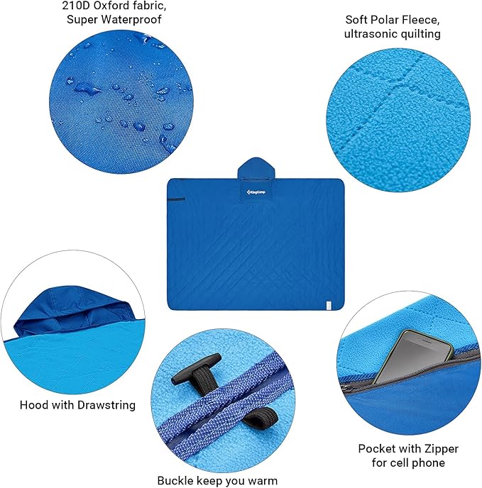 - 【100% WATERPROOF】 The backing is 210D Oxford fabric with PU3000 painting , KingCamp Stadium Blanket is more waterproof and durable. Ultrasonically quilted no seam holes allowing water to leak through. A new design Wearable Blanket Hoodie , better protect you from rain or storm.