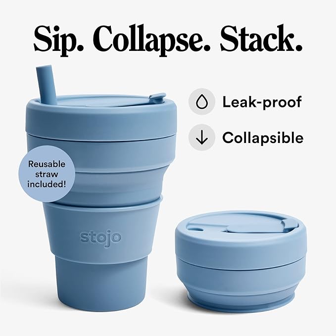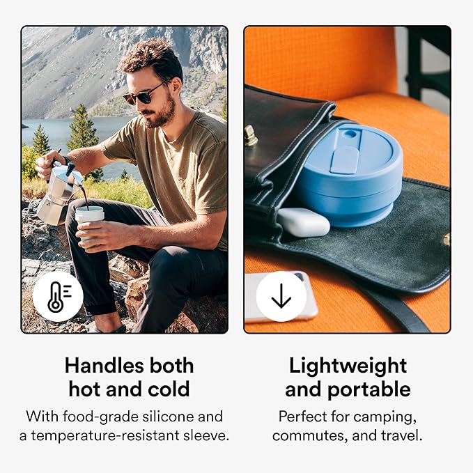 - Collapsible cup: It’s literally never been easier (or more fun) to BYO reusable cup! The 24 oz Cup is our largest size and collapses down to just 2.5 inches. Whether you’re sipping coffee or a smoothie, this cup is perfectly portable for your commute, camping trips, power smoothies, and travels. When you’re done, simply remove the heat sleeve, open the tab, and collapse it down. Leak-proof, includes a straw, fits standard cupholders, and get a load of that Steel Blue color!