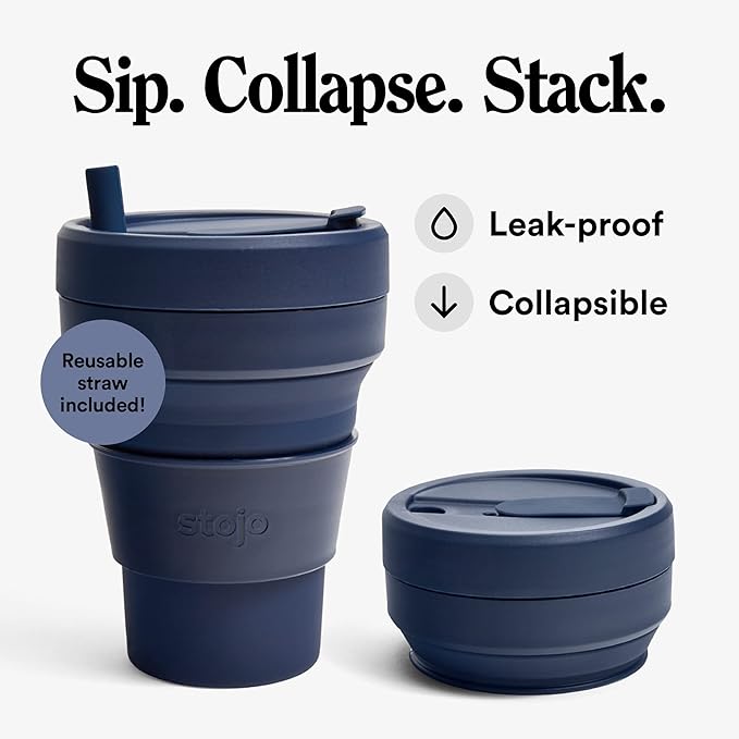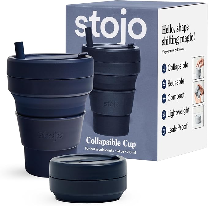 - Collapsible cup: It’s literally never been easier (or more fun) to bring your own reusable cup! The 24 oz Cup is our largest size and collapses down to just 2.5 inches. Whether you’re sipping coffee or a smoothie, this cup is perfectly portable for your commute, camping trips, power smoothies, and travels. When you’re done, simply remove the heat sleeve, open the tab, and collapse it down. Leak-proof, includes a straw, fits standard cupholders, and get a load of that Denim Blue color!