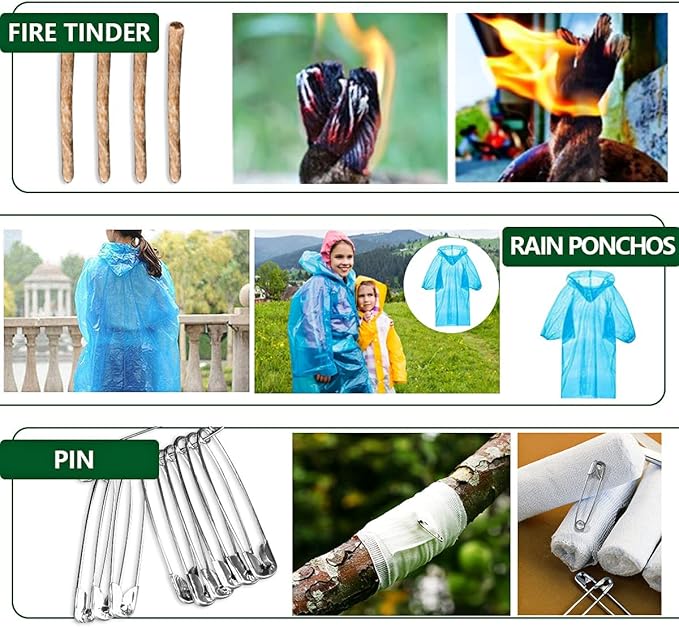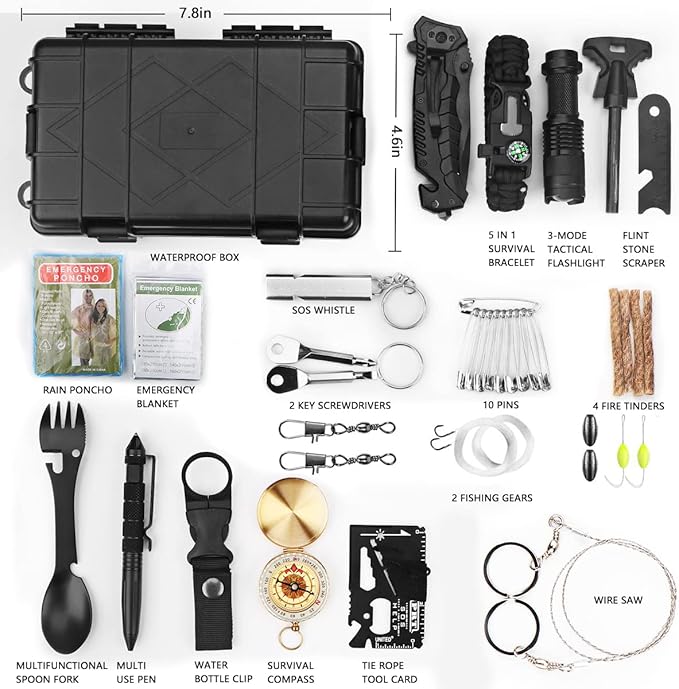 - ➤【Must Have 33 in 1 Emergency Survival Kit】This is a 33-in-1 professional survival kit.Included: waterproof box, tactical pen, survival compass, 3-mode tactical flashlight, water bottle clip, multi-use spoon fork, wire saw, 5 in 1 survival rope bracelet, multifunctional card, SOS whistle, rain poncho, fire starter, emergency blanket, fishing gear, key screwdriver, fire tinder, pin, etc.