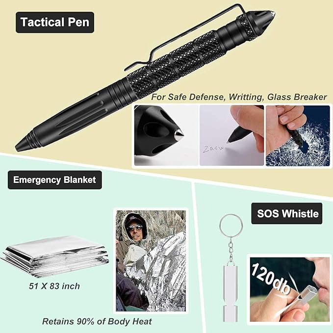 - Included Components : Whistle, Survival Bracelet, Flashlight, Emergency Blanket, Flint Stone Scraper, Parachute Cord, Tactical Pen, 18 in 1 Snowflake Tool, 14 in 1 Hatchet, Water Bottle Clip, Multi-use Spoon Fork, 2pcs Glow Sticks, Fishing accessories, 2pcs AA Battery, Storage Case Whistle, Survival Bracelet, Flashlight, Emergency Blanket, Flint Stone Scraper, Parachute Cord, Tactical Pen, 18 in 1 Snowflake Tool, 14 in 1 Hatchet, Water Bottle Clip, Multi… See more