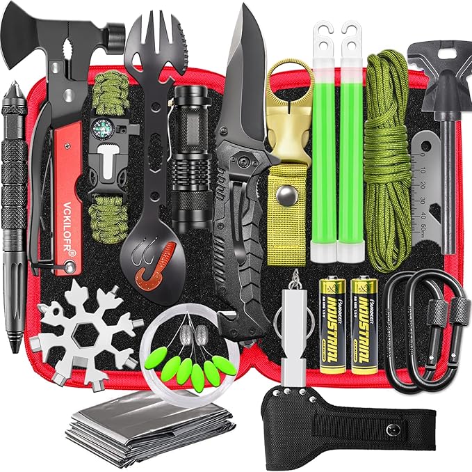 - Necessary Equipment You Must have: Contains 14 in 1 Hatchet, Tactical Pen, 18 in 1 Snowflake Tool, Water Bottle Clip, Emergency Blanket, Flint Stone Scraper, Flashlight, 2 pcs Glow Sticks, Multi-use Spoon Fork, Whistle, Parachute Cord, Survival Bracelet, Fishing accessories, 2pcs AA Battery, and Storage Case.