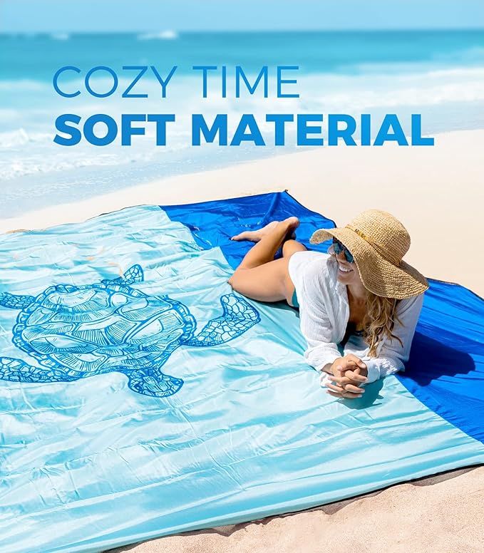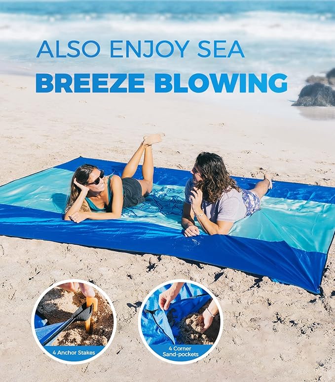 - Sand proof Beach Blanket - New material keep the sand easy cleaning off. Four sand pockets can be filled in sand or rocks to help keep your blanket grounded on the beach. Four stake loops to keep it grounded on firmer ground. No need to worry about mat getting crumpled or ripped.