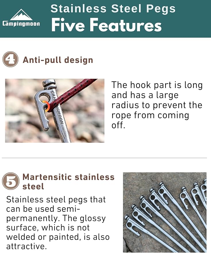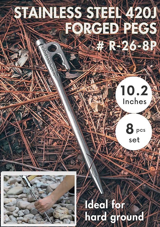 CAMPINGMOON Tent Stakes 10.2-inch 8pcs Martensitic Stainless Steel 420J2 Hardened Forged Power Peg Ideal for Hard Ground R-26-8P