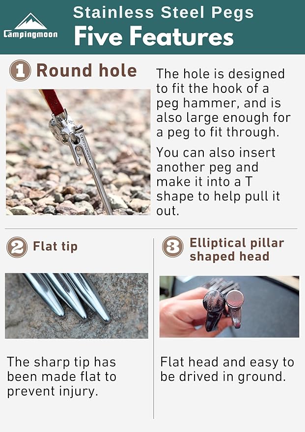 - 【Round Hole】The hole is designed to fit the hook of a peg hammer for easy pulling out, and is also large enough for a peg to fit through.