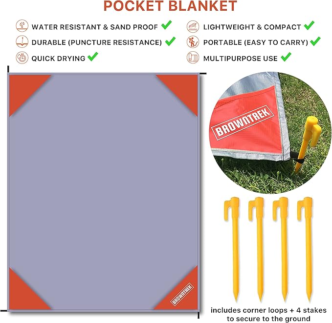 - Compact Lightweight & Durable: Browntrek travel picnic blanket is a compact blanket, lightweight and super small enough to fit in your purse, bag, backpack and even in your pocket. When you unpacked this sand blanket it allows up to 2 Adults or 4 Children to sit comfortably. The corner loops allow you to stick and unstick at any time.