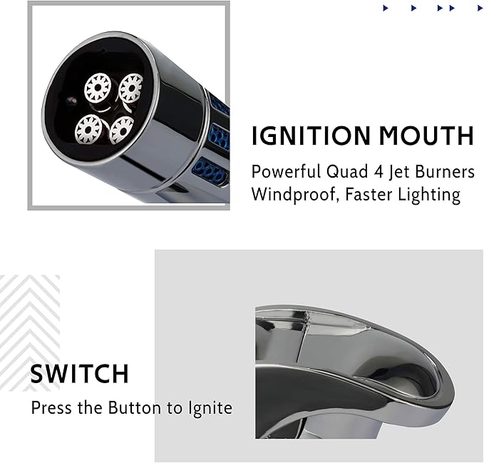 - Quad 4 Jet Flame: Windproof jet flame of 4 burners has much quicker lighting than other flame lighters. The Portable lighter can be used for camping, grill, candles, fireworks, BBQ and more.