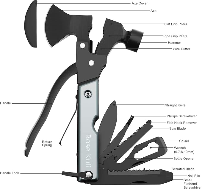 - COMPACT MULTI TOOLS HATCHET: Contains 18 different tools including Axe, Hammer, Knife, Screwdrivers, Wrenchs. It's made of high-grade stainless steel and the tools are covered with durable black oxidation, this makes them rust-resistant, service life is extended perfectly. Definitely super cool dad presents and gadgets for men.