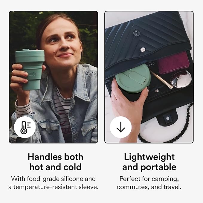 - Collapsible cup: It’s literally never been easier (or more fun) to bring your own reusable cup! This compact cup collapses down to just 2 inches. Whether you’re enjoying coffee or smoothies, the 12 oz Stojo is perfectly portable for your commute, camping trips, and travels. When you’re done, simply remove the heat sleeve, open the tab, and collapse it down. Leak-proof, fits standard cupholders, and get a load of that Eucalyptus Green color!