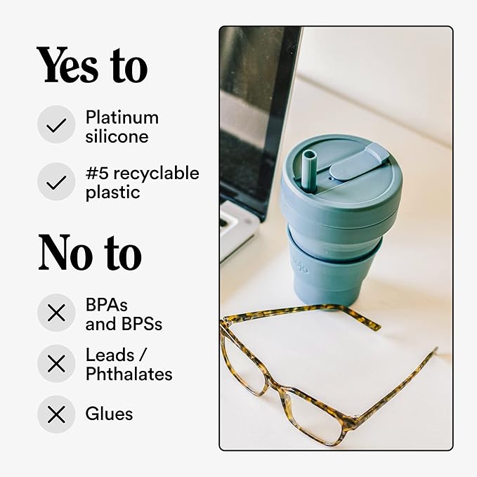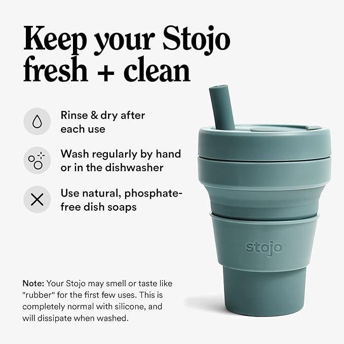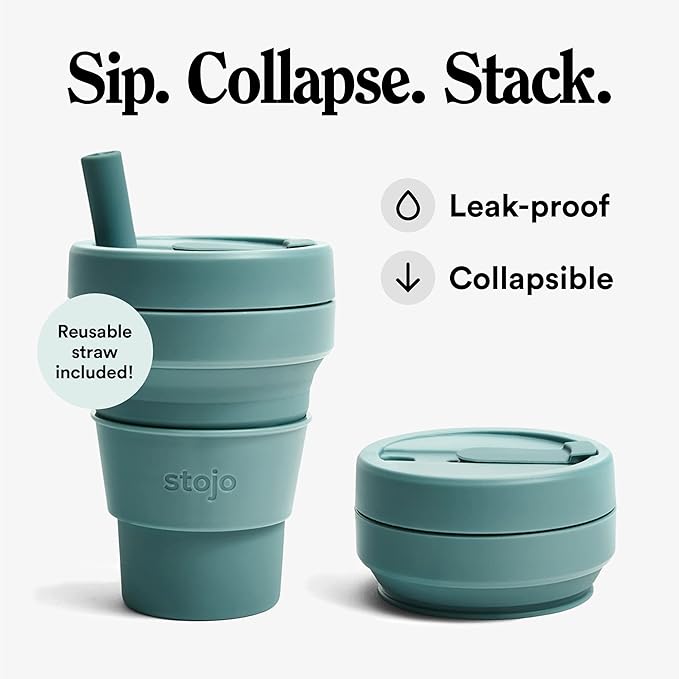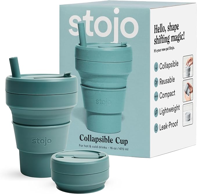 - Collapsible cup: It’s literally never been easier (or more fun) to bring your own reusable cup! This compact cup collapses down to just 2 inches. Whether you’re sipping coffee or a smoothie, the 16 oz Stojo is perfectly portable for your commute, camping trips, tea at home, and travels. When you’re done, simply remove the heat sleeve, open the tab, and collapse it down. Leak-proof, includes a straw, fits standard cupholders, and get a load of that Eucalyptus Green color!