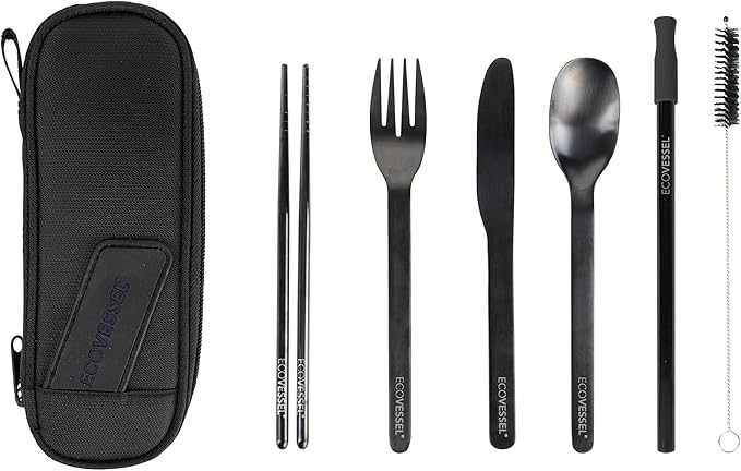 EcoVessel WANDERWARE Stainless Steel Utensils Set, Reusable Cutlery Set with Carry Case Camping Accessories, Travel Utensils With Case – 6 Pcs (Black Smoke)