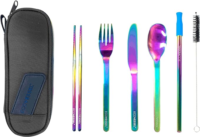 EcoVessel WANDERWARE Stainless Steel Utensils Set, Reusable Cutlery Set with Carry Case Camping Accessories, Travel Utensils With Case – 6 Pcs (Rainbow)