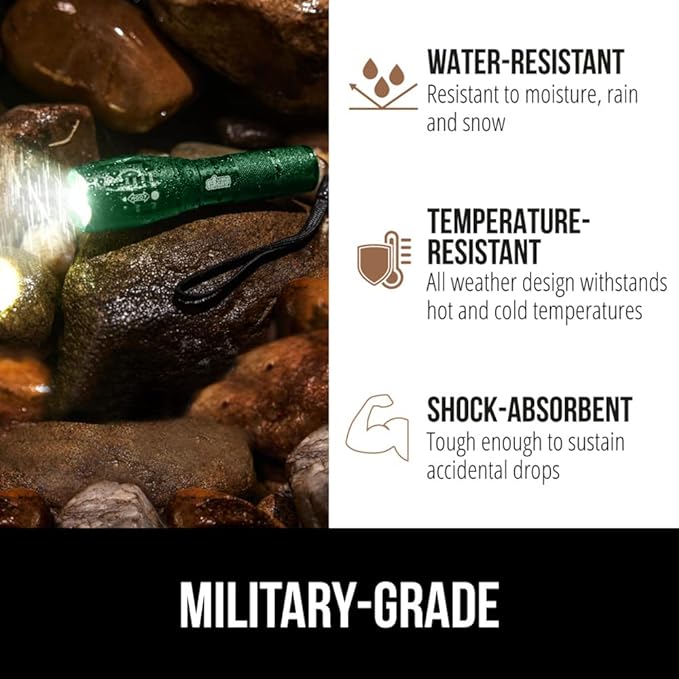 - EXTREMELY DURABLE: all weather, ultra durable aluminum alloy flashlight is shock resistant, water resistant, and temperature resistant; the perfect option for any outdoor activity; take it with you hiking, camping, biking and more; flashlight is tough enough to sustain accidental drops up to 3.3 feet as well as water submersions; includes a run time of up to 9.5 hours