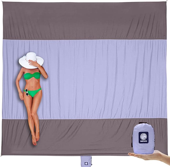 WEKAPO Beach Blanket Sandproof, Extra Large Beach Mat, Big & Compact Sand Free Mat Quick Drying, Lightweight & Durable with 6 Stakes & 4 Corner Pockets