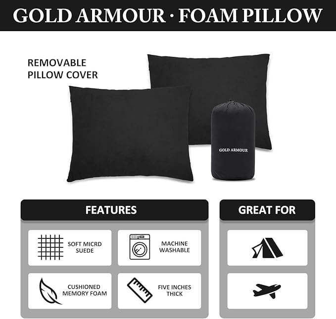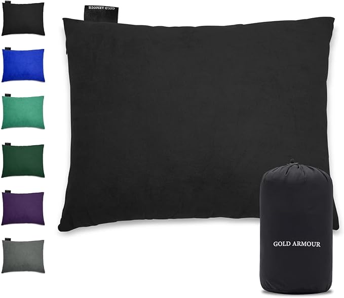 Gold Armour Camping Pillow - Backpacking and Travel Pillow for Sleeping and Traveling - Compressible Memory Foam Travel Pillow - Essential Camping Accessories Gear (Medium 14x18in, Black)