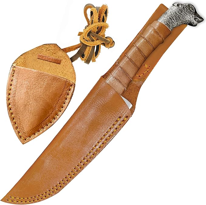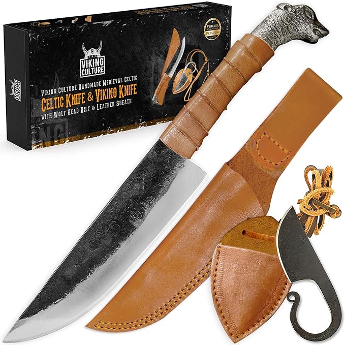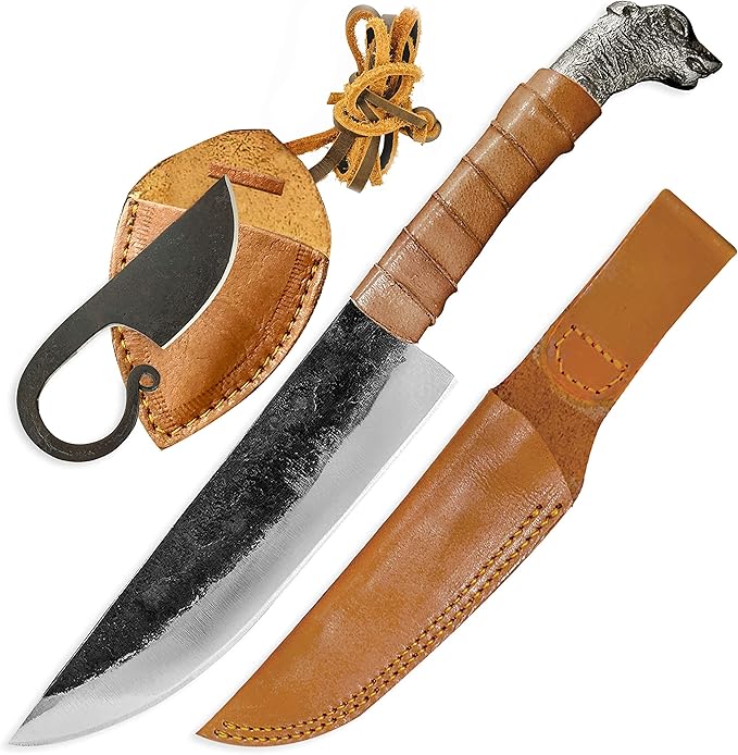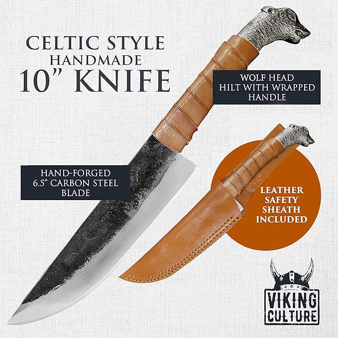 - 🗡️ FULL VIKING DECOR - This 10" knife has a 6.5" carbon steel blade with an intricately-designed Wolf head heel. The handle is wrapped with a premium leather grip to give it an old-world feel.