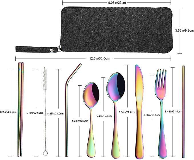 - ⭐ [ 9 PIECES TRAVEL UTENSILS INCLUDE ] : 1 X Chopsticks, 1 X Dinner Knife, 1 X Dinner Fork, 1 X Dinner Spoon, 1 X Dessert Spoon, 1 X Straight Straw, 1 X Bent Straw, 1 X Straw Cleaning Brush, 1 X Carrying Case. Free experience 4 pieces of food-grade silicone straw cases.