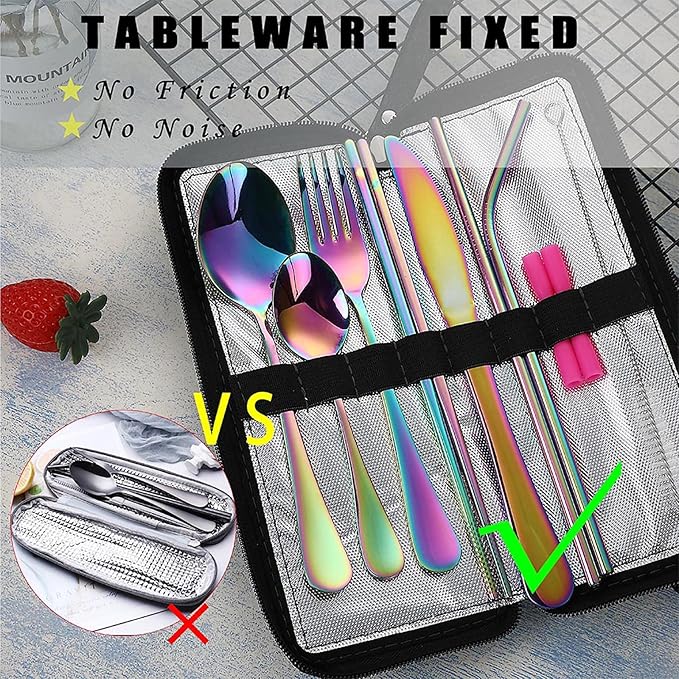 VANDBAO Camping Utensils Set, Portable Travel Utensils with Case for Fixing Tableware, Reusable Stainless Steel Stable Cutlery Set, Lunch Picnic Flatware Silverware (Rainbow Set)