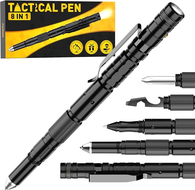 - 8-in-1 Multitool Pen and MORE! Multitool Pen with LED flashlight (High beam and Strobe mode )+glass breaker+ballpoint pen+4 in 1 tools+phillips screwdriver+pen clip. FREE BONUS: 4 in 1 Survival bracelet (Flint and steel+Whistle+Compass+Paracord) + 3 Black Refills + 3 sets Batteries. PARIGO pen is well crafted compact multitool pen, combining the most needed everyday-carry tools, also very suitable for adventure in the wild.