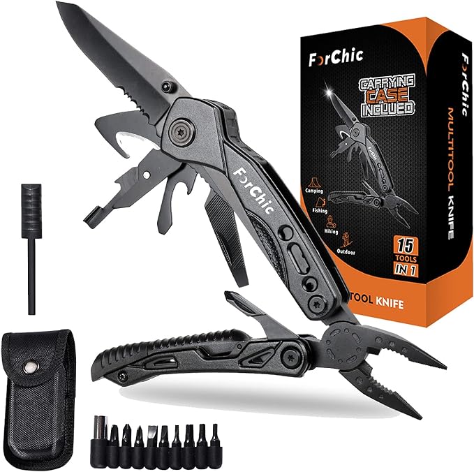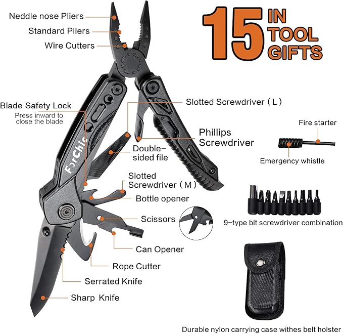 - All in One Tools: 15 in 1 tool gifts including Needle nose Pliers, Standard Pliers, Wire Cutters, Scissors, Fire starter, Emergency whistle, Can Opener, Bottle opener, Slotted. Screwdriver (M)(L), Phillips Screwdriver, Double-sided file, Rope Cutter, a screwdriver with a 9-in-1 bit set, and Durable nylon carrying case with belt holster.