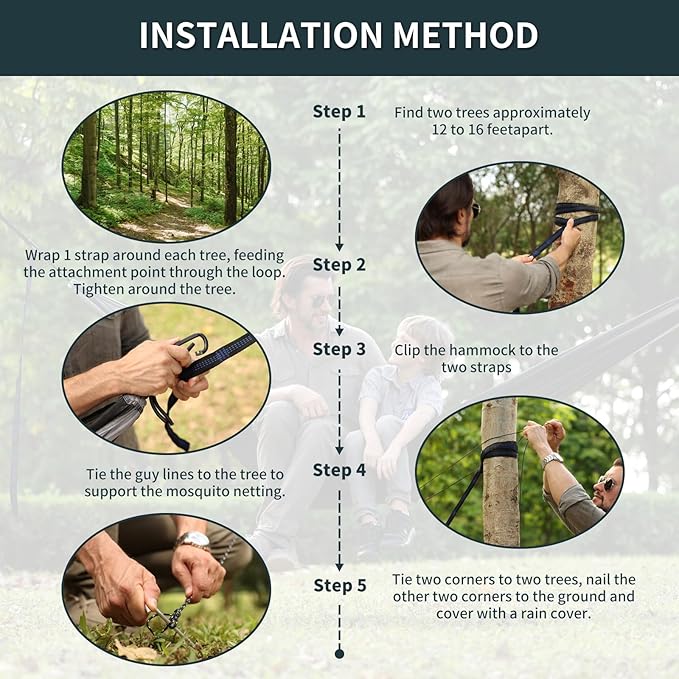 - 【EASY TO INSTALL】: Single hammock size is 114 x 57 inch. Can be folded into the small attached sack. The bundled bag dimensions size only 9 x 5 inch and weighted as 2.5 lbs, making it portable. You can adjust hiking hammock to the perfect height with tree straps, wrap and tighten the straps around the trees and get to relaxing in just one minute
