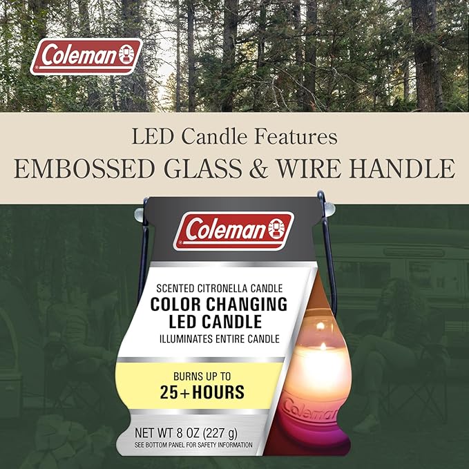 - Extended Burn Time: The 8oz Coleman Color Changing LED Citronella Candle offers up to 25 hours of continuous burn time, ensuring a prolonged and enchanting outdoor ambiance, whether used in the backyard or taken along on your outdoor adventures.
