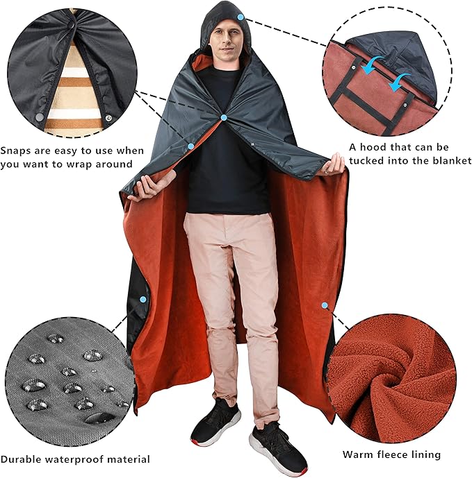 - 【Hooded Design】This blanket poncho comes with a hood that can be tucked into the blanket. When it starts raining you can use it as a rain coat , just simply put the hood on and wrap it around you.