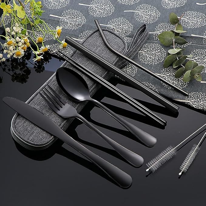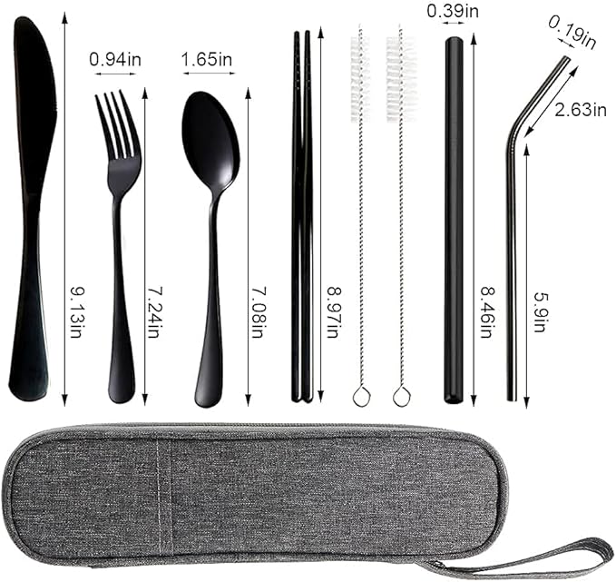 - The travel utensils incluede dinner knife, fork, spoon, chopsticks, Curved straw,Boba straw,cleaning brush ,carrying bag.