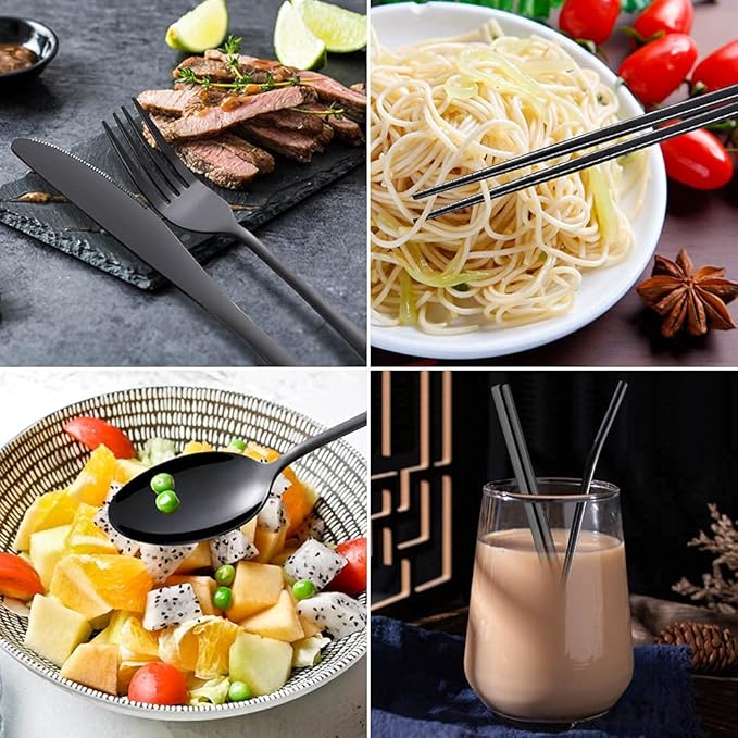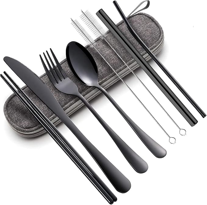 - Included Components : Dinner knife, fork, spoon, chopsticks, curved straw, boba straw, cleaning brush, carrying bag